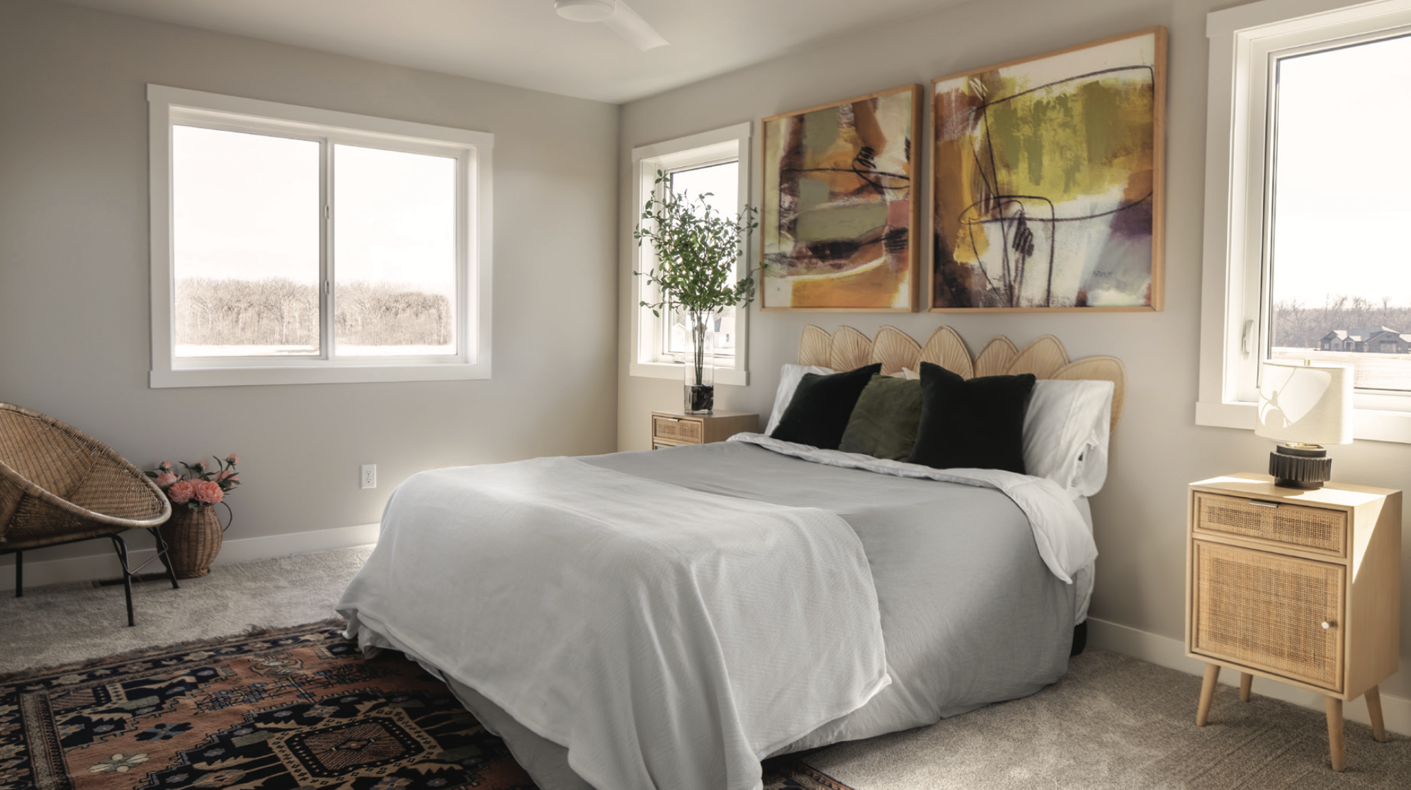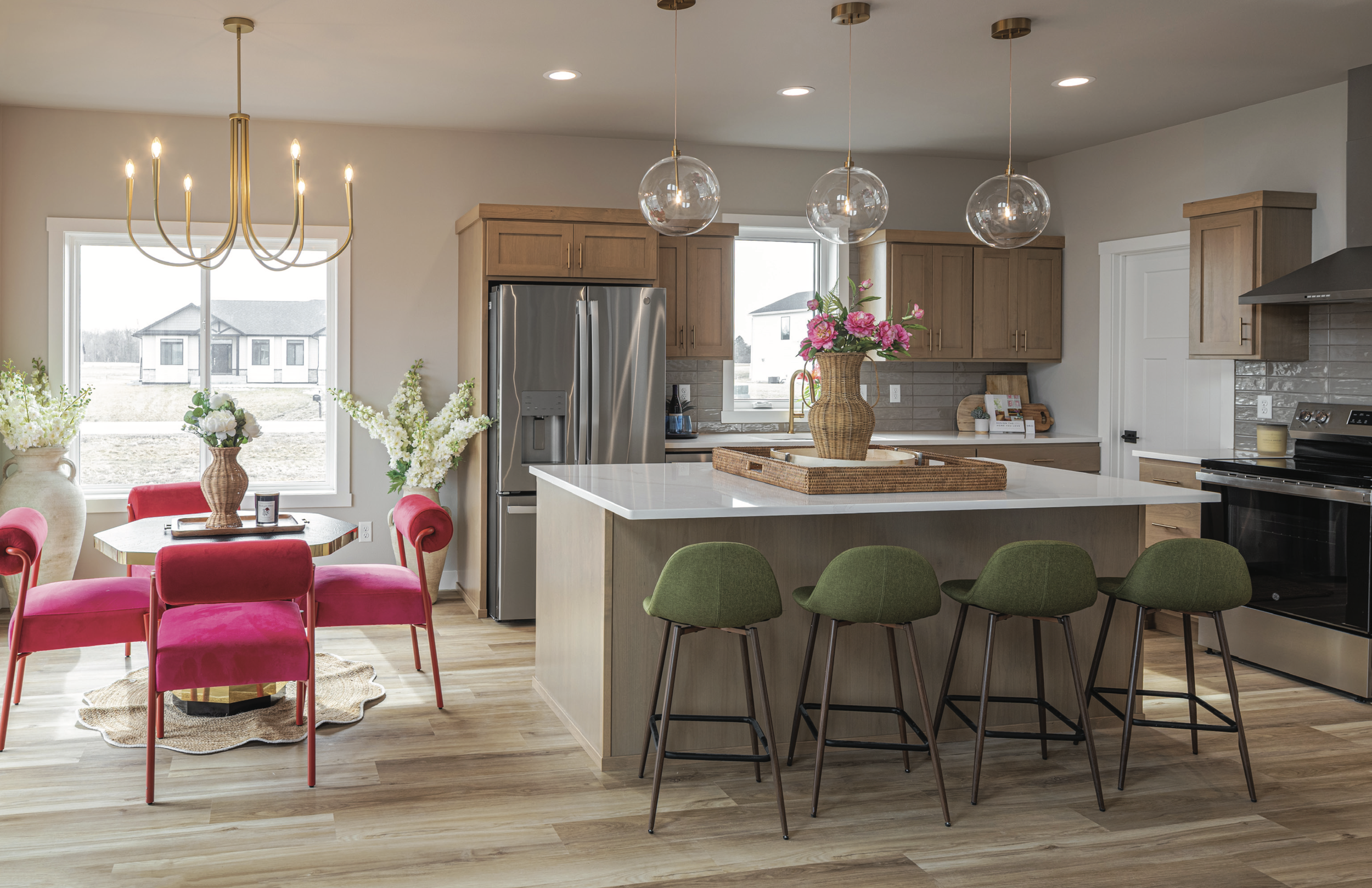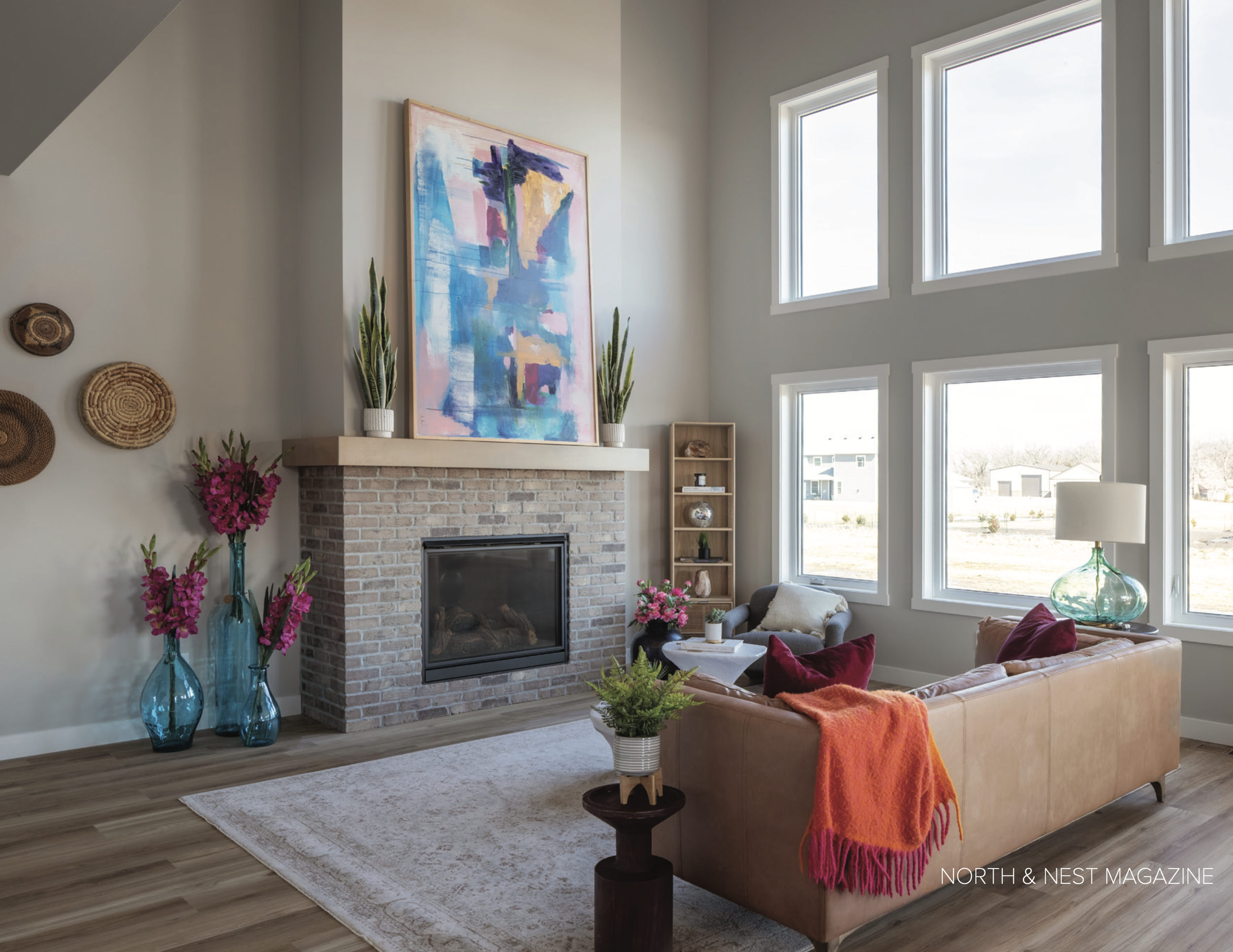 The best way to explore Novel's design process is to explore their latest model home, the Emma, located on nearly one acre of countryside in Moorhead's newest rural neighborhood, the Preserve on Broadway. This two-story, 3,467-square-foot home has just recently hit the market, including four beds, three-and-a-half baths, and a fully finished basement. While the home itself is a blank canvas with neutral, calming tones throughout, Melanie staged it with a West Coast vibe of vibrant colors and tones for an airy springtime feel.