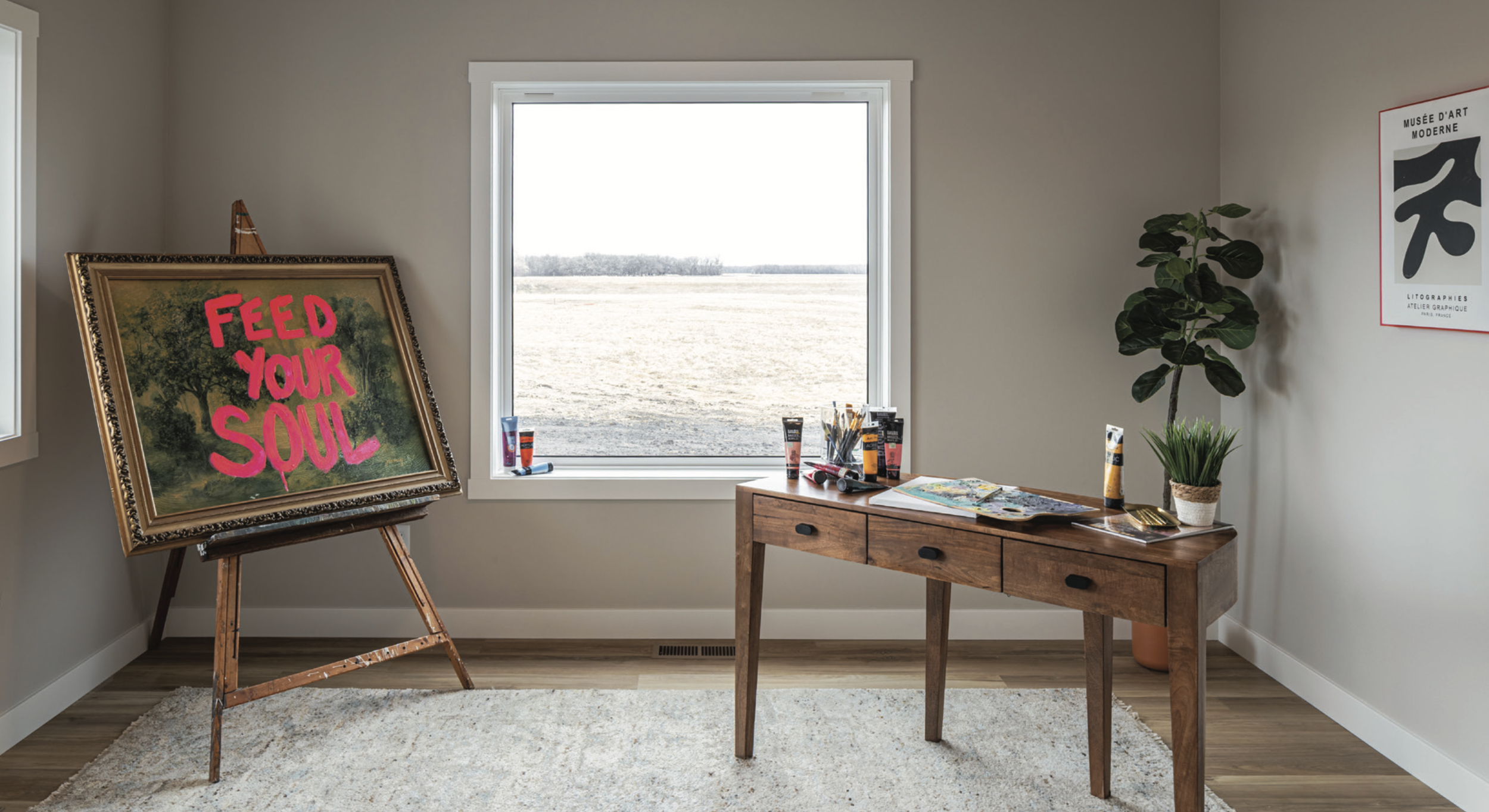Across from the main foyer, the large office is staged as an art studio to showcase its expansive windows. "This room was designed to be what you want it to be: an office, a creative studio, or a children's playroom," added Rudd. "This room wasn't actually part of the original floor plan for this model, but it was added on to create space for the lower level's workout room."