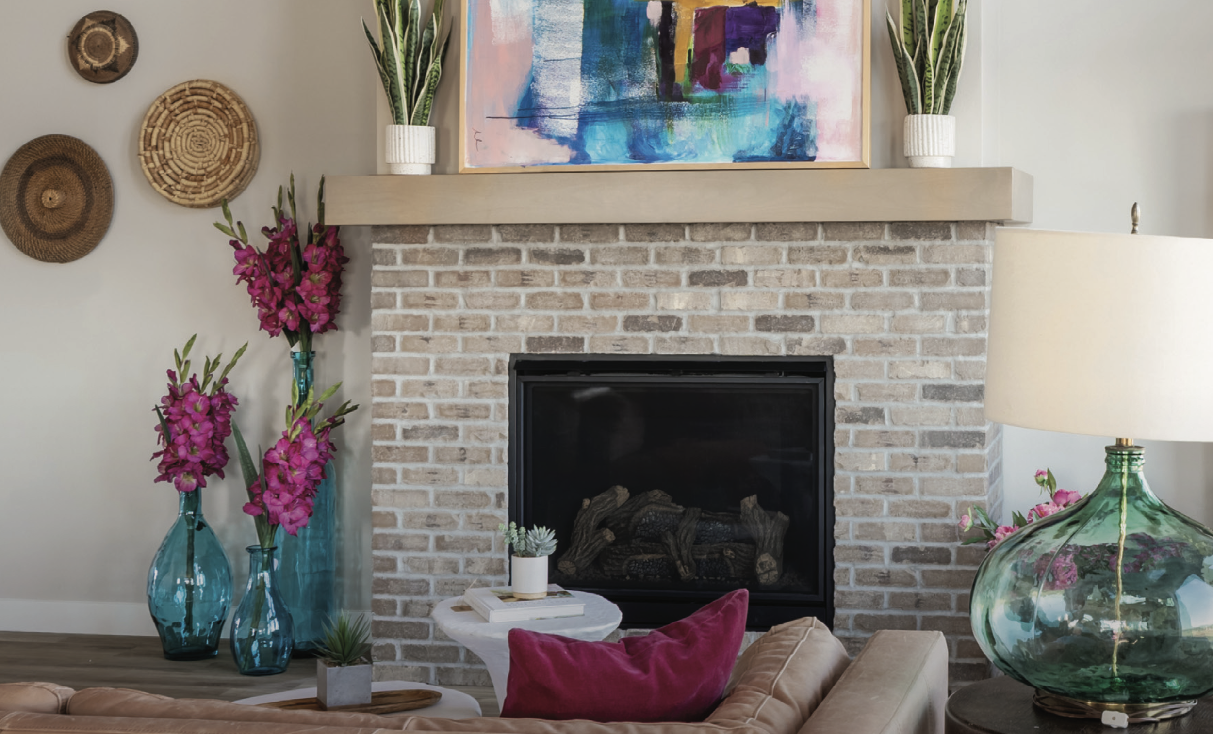 This home's true living experience is wide open, with 20-foot ceilings and six massive windows that frame countryside views. The space is designed to carry natural light, artfully flowing from the living room to the kitchen and upstairs catwalk. To ensure the open concept feels cohesive throughout, Melanie chose a Sherwin-Williams Agreeable Gray for the walls, an LVP wood-plank throughout, and a brick fireplace surround with a custom mantel that repeats the lighter tone of the kitchen cabinet stain. Adding vibrant color in the expanse above the mantel is a stunning abstract piece created by Melanie.